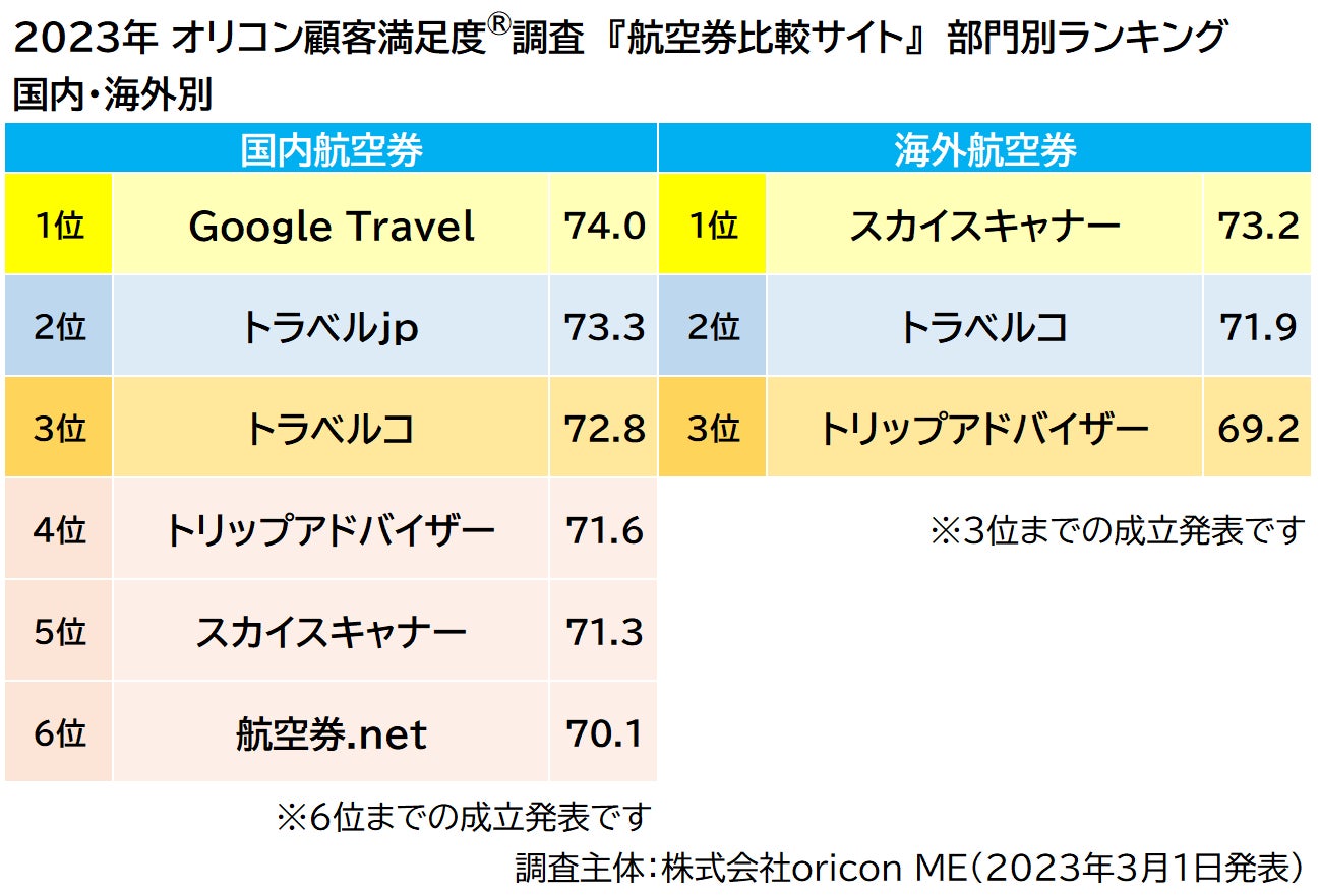 ■定義:複数の旅行予約サイトの商品情報を横断的に検索・比較できる「旅行情報比較サイト」の内、航空券の情報を取り扱う「航空券比較サイト」を運営する企業。総合ランキング、及び評価項目別ランキングランクイン条件として、「国内航空券」、「海外航空券」どちらの情報も取り扱うサイトを対象とする。
