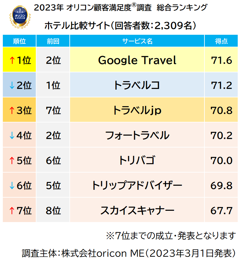 - 『ホテル比較サイト』(回答者数:2,309名)【Google Travel】が初の総合1位