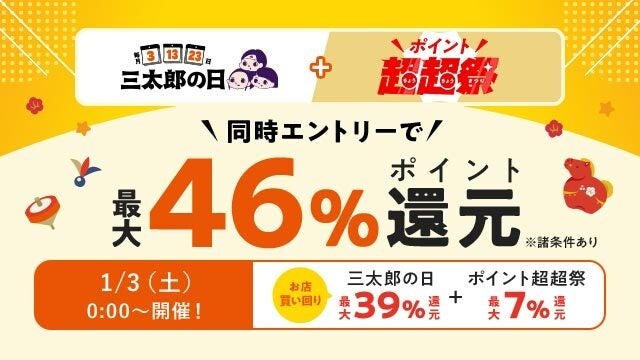 年始の初売りからバレンタイン準備まで、季節のイベントに合わせた超目玉商品や福袋、最安値挑戦商品などのおトクな目玉商品や、割引クーポン、ポイント還元などの特典を提供します。複数店舗の買い回りでポイント還元する「お買い物ラリー」特典とあわせて最大39%のポイント還元となり、さらに2026年1月3日は「ポイント超超祭」と同時エントリーいただくことで、最大46%のポイントを還元します。