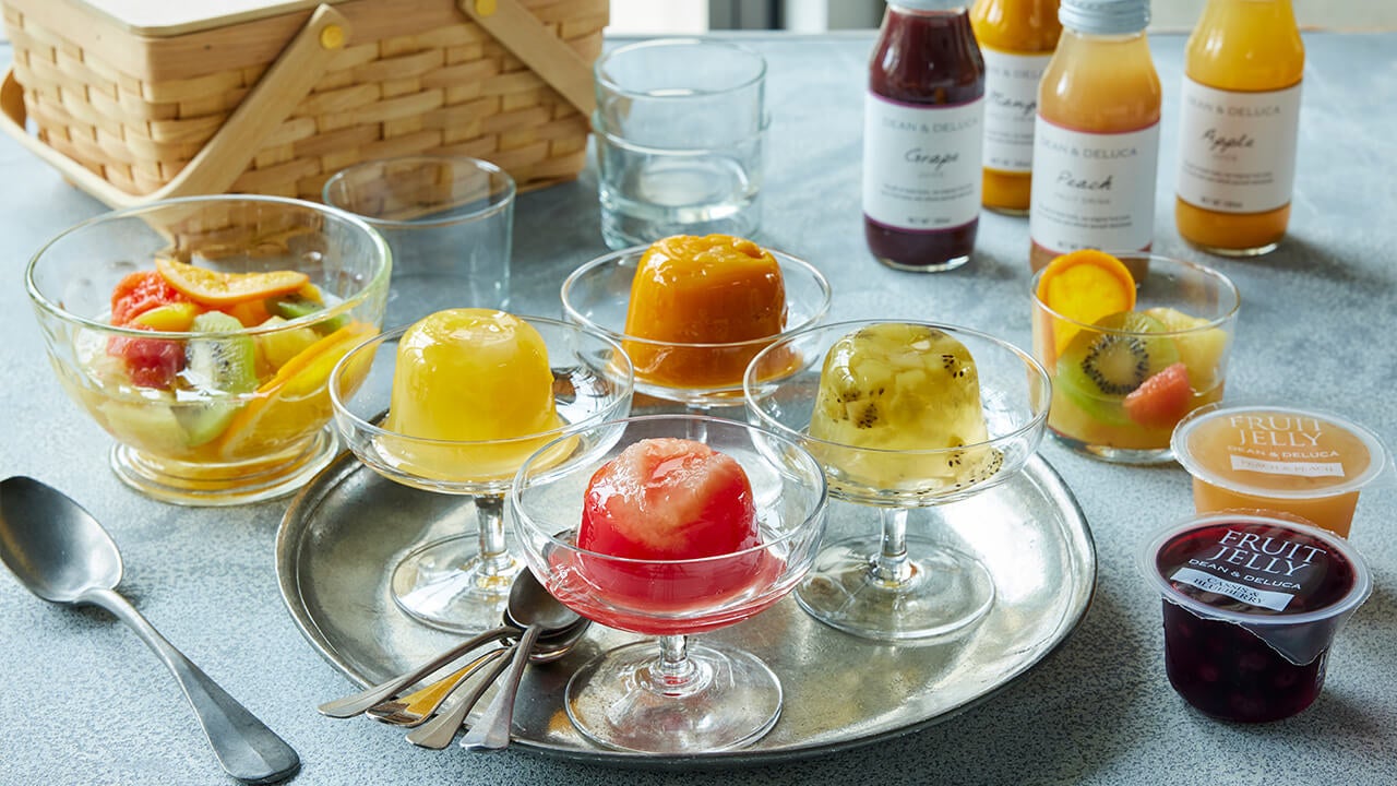 それぞれの果物がもつ酸味や甘みなどの魅力を掛け合わせ、まるでもぎたてのような、みずみずしくとろける食感に仕上げたフルーツゼリーや、日本を代表する2種類のお茶を、香り高くすっきりとした和のゼリーに仕立てた日本茶ゼリーも揃います。