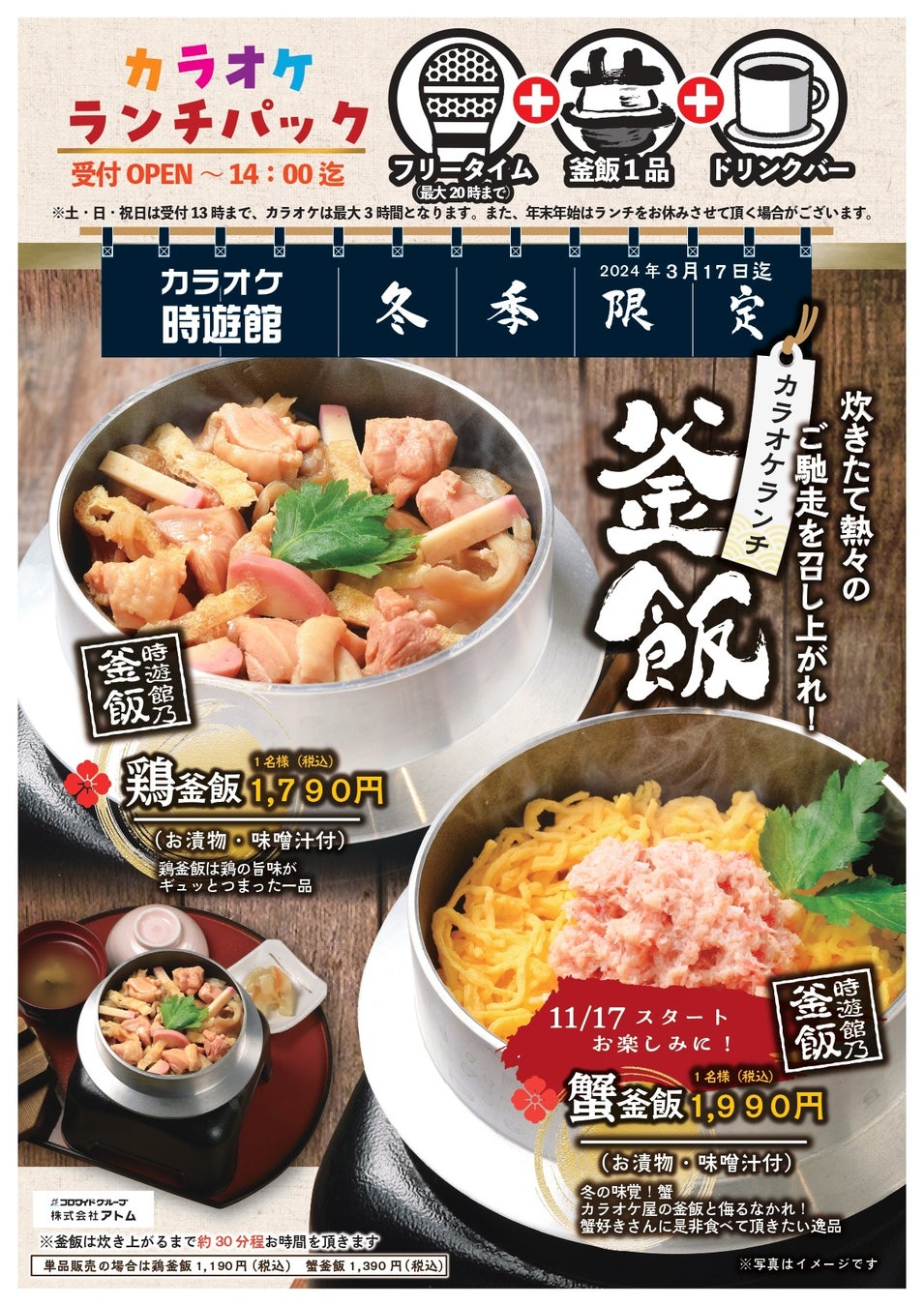 ~「カラオケ時遊館(じゆうかん)」~今年の1次会・2次会、どちらもお任せ新プランをご用意更に、ランチに新釜飯2種が登場!!2023年11月17日(金)~