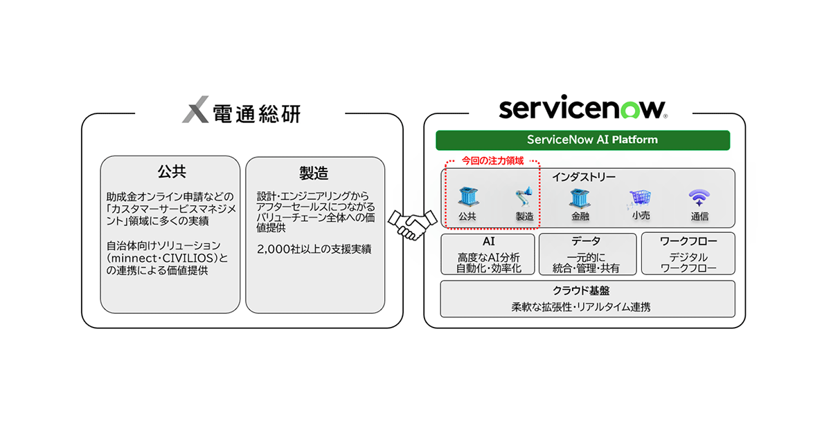 こうした背景を踏まえ、電通総研とServiceNowは、両社が培ってきた知見・ノウハウとテクノロジーを掛け合わせ、部分最適に留まらず、全体最適に向けた新たな製造業と公共分野向けの統合型DXソリューションを提供する運びとなりました。