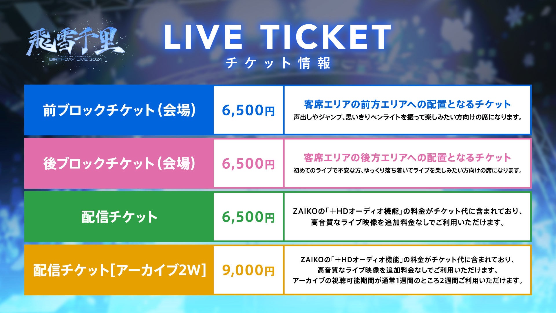 配信プラットフォームZAIKOの「+HDオーディオ機能」の料金がチケット代に含まれており、高音質なライブ映像を追加料金なしでご視聴いただけます。