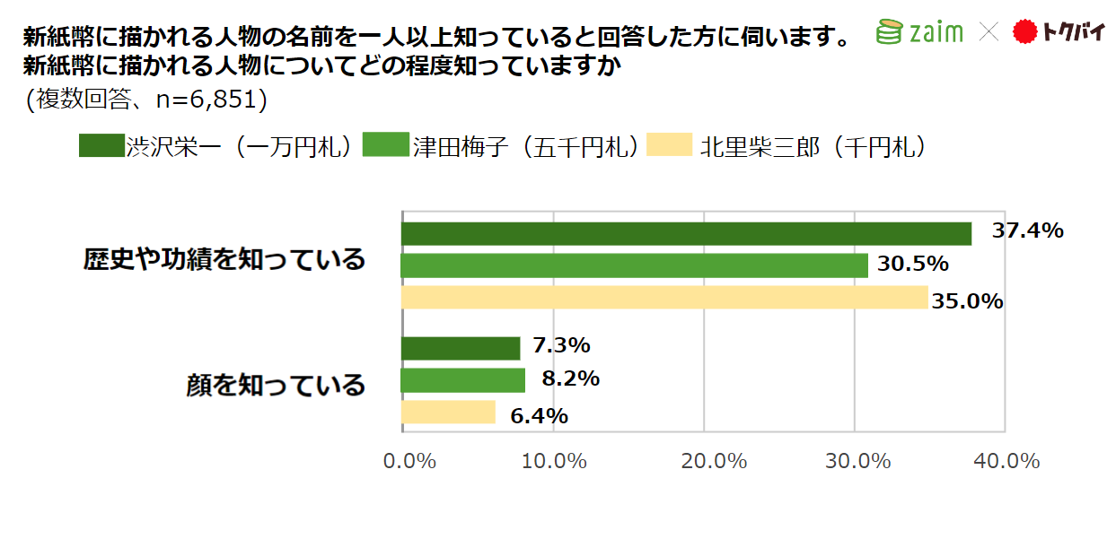 2024年7月3日からの「新紙幣の発行」について知っているかたずねたところ、9割以上が「知っている」と回答しました。その内、「新紙幣に描かれる人物の名前を一人以上知っている」と回答した方に、その人物の功績、顔をどの程度把握しているかをたずねたところ、「歴史や功績を知っている」のは「渋沢栄一(一万円札)」37.4%、「津田梅子(五千円札)」30.5%、「北里柴三郎(千円札)」35.0%と3割程度におよんだ一方で、新紙幣に印刷される「顔」の認知度は「渋沢栄一」7.3%、「津田梅子」8.2%、「北里柴三郎」6.4%と、それぞれ1割に満たない結果となりました。