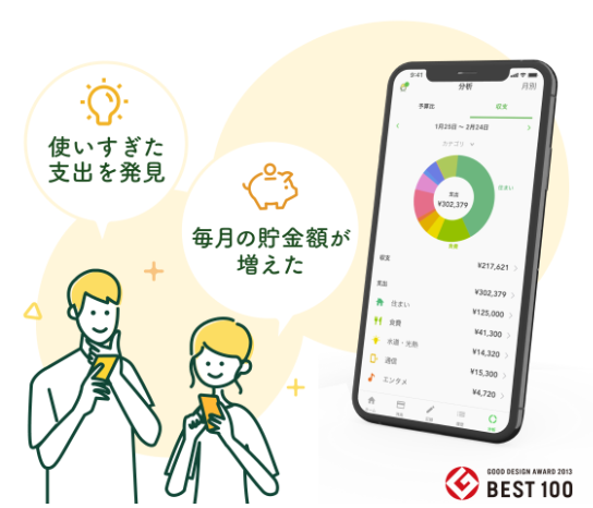 1,100 万ダウンロードを超える家計簿サービス「Zaim」は、スマートフォンなどから簡単に家計簿を記録できるサービスです。紙のレシートを撮影して自動で読み取る機能に加え、銀行やクレジットカードとの連携機能によって支出や収入を自動的に記録できるため、手軽に家計を管理できます。