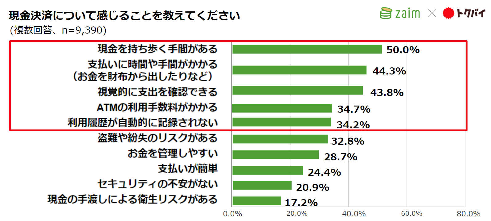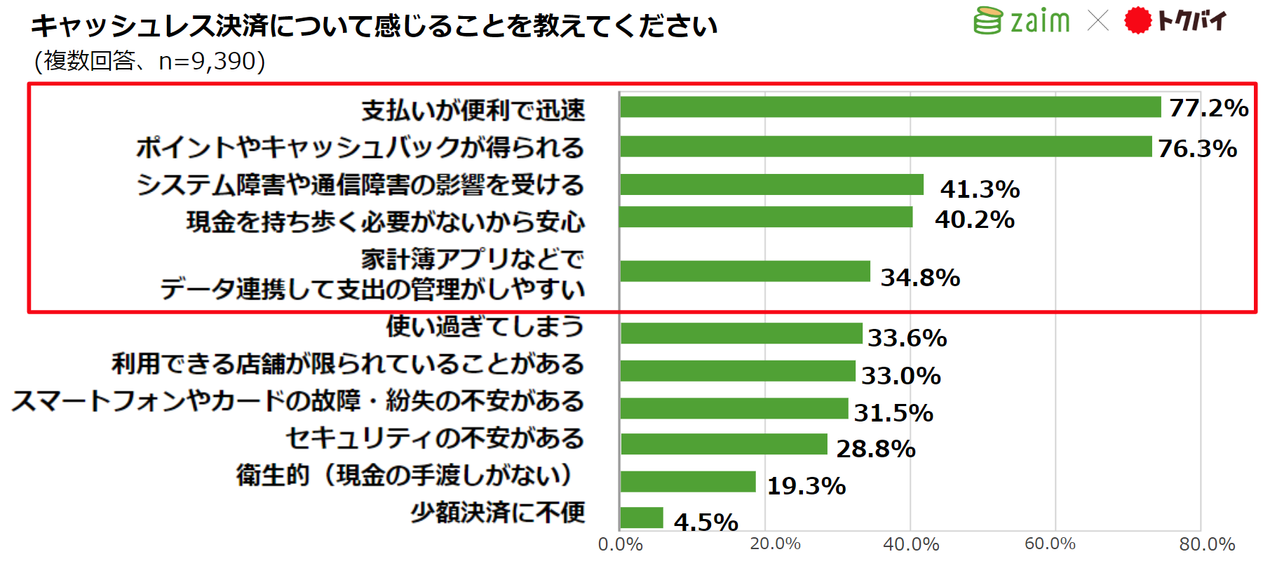 現金とキャッシュレス決済それぞれについて感じることをたずねたところ、現金決済は「現金を持ち歩く手間がある」50.0%が最多、「支払いに時間や手間がかかる(お金を財布から出したりなど)」44.3%、「視覚的に支出を確認できる」43.8%、「ATMの利用手数料がかかる」34.7%、「利用履歴が自動的に記録されない」34.2%と続きました。キャッシュレス決済では「支払いが便利で迅速」77.2%が最多、次いで「ポイントやキャッシュバックが得られる」76.3%、「システム障害や通信障害の影響を受ける」41.3%、「現金を持ち歩く必要がないから安心」40.2%、「家計簿アプリなどでデータ連携して支出の管理がしやすい」34.8%となりました。