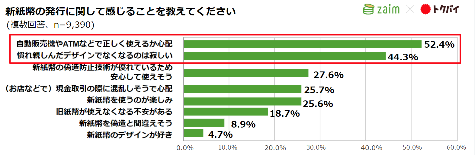 続いて、「新紙幣の発行」について感じることをたずねたところ、半数以上が「自動販売機やATMなどで正しく使えるか心配」と回答し、「慣れ親しんだデザイン(福沢諭吉など)でなくなるのは寂しい」と現在の紙幣を惜しむ声も4割以上にのぼりました。