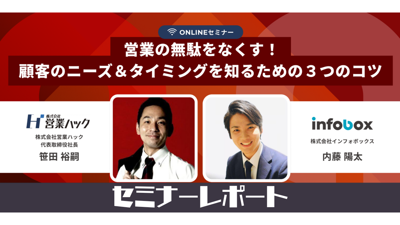 今回のテーマは「顧客のニーズとタイミングの知り方」。売れる営業は、「今なら売れる」「この人なら売れる」という確信を得る手段を持ち合わせています。それは一体何なのか。どのようにして顧客のニーズとタイミングを知っているのか、営業のプロ2名が徹底解説させていただきました!