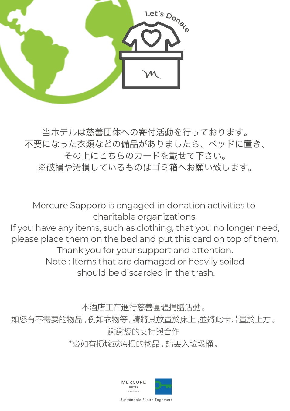 メルキュール札幌では、環境に配慮し、日常業務において環境に配慮した持続可能な取り組みを提唱しています。さまざまな環境と持続可能性への取り組みは、当ホテル運営の中核的な柱であり、周辺コミュニティに社会的および環境的利益をもたらすよう努めています。私たちは、世界の観光産業における当ホテルの役割を認識し、私たちの活動の長期的で持続可能な運営に努め、業界全体の持続可能な発展に積極的に貢献しています。