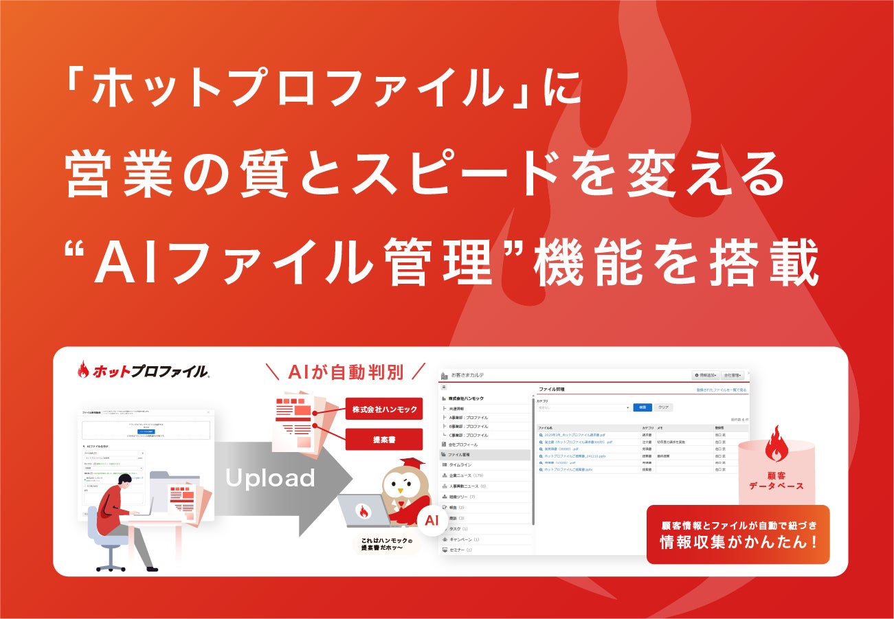 株式会社ハンモック(本社:東京都新宿区、代表取締役社長:若山 大典、証券コード:173A、以下「ハンモック」)は、クラウド型名刺管理・営業支援ツール「ホットプロファイル」 において、AIを活用したファイル管理機能を2025年6月下旬より提供開始することを発表いたします。
