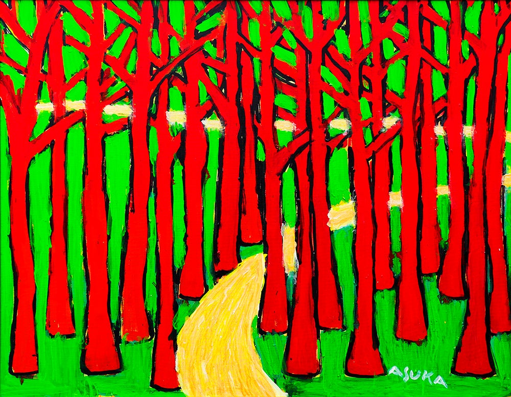 「森の道-青い森」(左)、「森の道-赤い森」(中)、「森の道-赤い森2」(右)