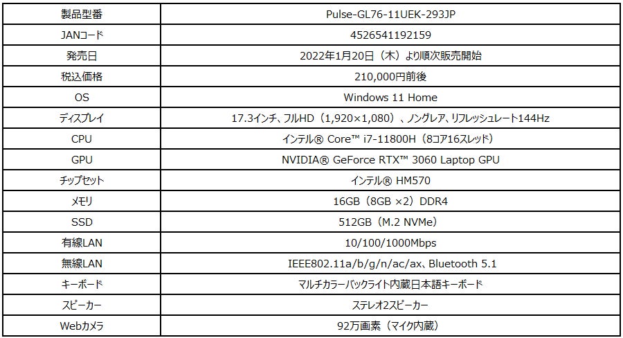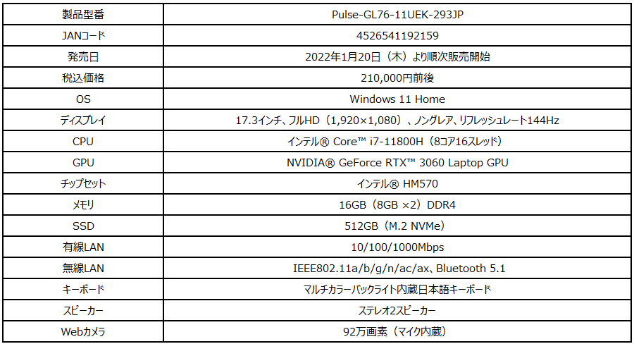 「GP76-11UG-1023JP」は高性能CPUと最新グラフィックス「GeForce RTX™ 3070 Laptop GPU」に加え、リフレッシュレート144Hz液晶パネルを搭載したeスポーツグレードゲーミングノートPCです。大人気バトルロイヤルゲームや最新FPSで勝ちに拘るプレイをしたいというハードゲーマーにおすすめな構成になっています。「Pulse-GL76-11UEK-293JP」は「GeForce RTX™ 3060 Laptop GPU」を搭載しつつ、税込み21万円前後を実現したミドルスペックモデルです。幅広いジャンルのゲームをフルHD解像度の高画質でお楽しみただけるパフォーマンスを提供します。また、限られた予算の範囲内でこれからPCゲームを始めたいという方にはGF63 Thinシリーズがおすすめ。国内向けオンラインゲームをフルHD解像度の高画質で快適にお楽しみいただけます。「GF63-11UC-062JP」と「GF63-11SC-063JP」は、薄さ21.7mm・軽さ1.86kgの薄型・軽量デザインを採用しており、ゲーミングノートPCながら気軽に持ち運べる携帯性を備えていることも大きな特徴です。