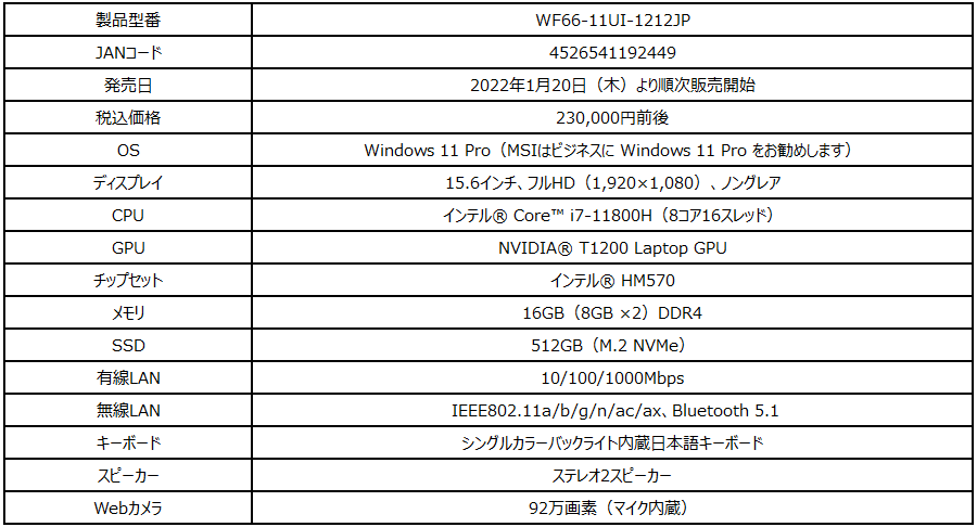 「WF66-11UI-1212JP」はGPUにプロフェッショナル向けグラフィックス機能「NVIDIA® T1200 Laptop GPU」を搭載し、3DCADや3Dグラフィックスデザインなどプロ向けのソフトを安定動作させることが可能になっています。さらに、マルチタスクに強く高い処理性能を発揮するCPU「Core™ i7-11800H」を搭載。CPU・GPU共にデスクトップPC並みのパフォーマンスを備えつつ2.25kgの本体重量で持ち運べるワークステーションを実現しました。