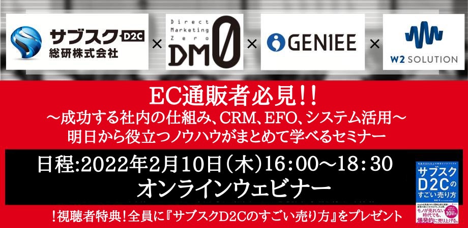 そこで多くのEC・通販事業を支援している【サブスクD2C総研】【DM0】【GENIEE】【w2】が、各社が持っている成功事例のノウハウを公開するセミナーを行います。