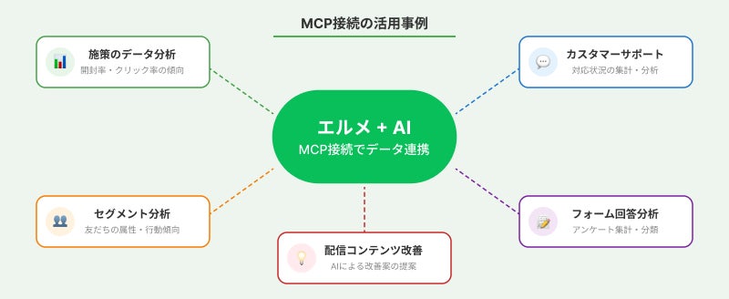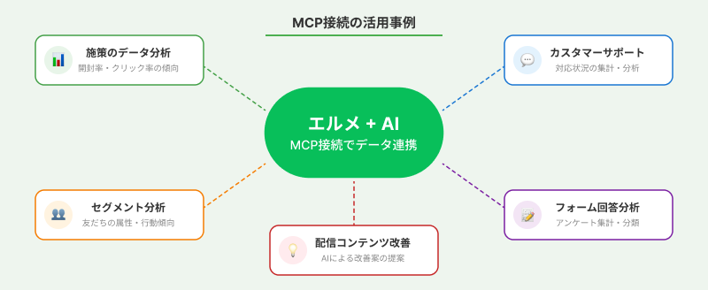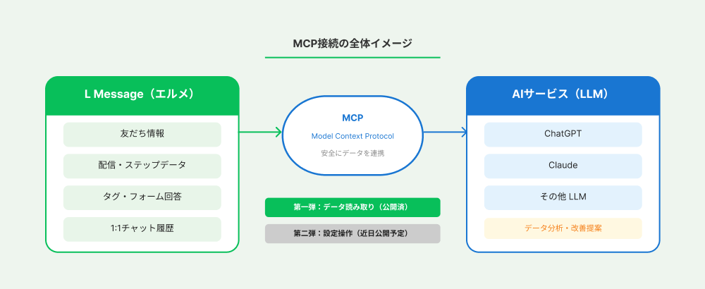 MCP(Model Context Protocol)とは、サービス内のデータを外部AIと安全に連携するための仕組みです。エルメMCPでは、L Messageに蓄積された配信データや顧客データをAIが参照できる状態にし、分析や改善提案に活用できるようにします。
