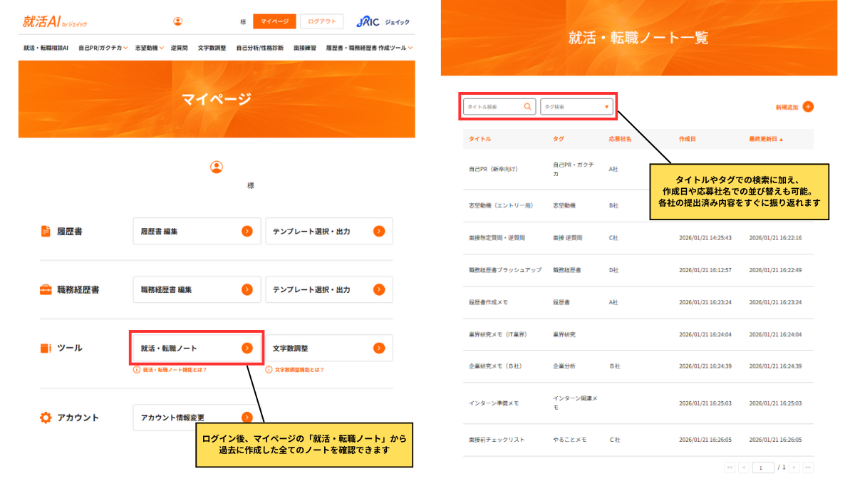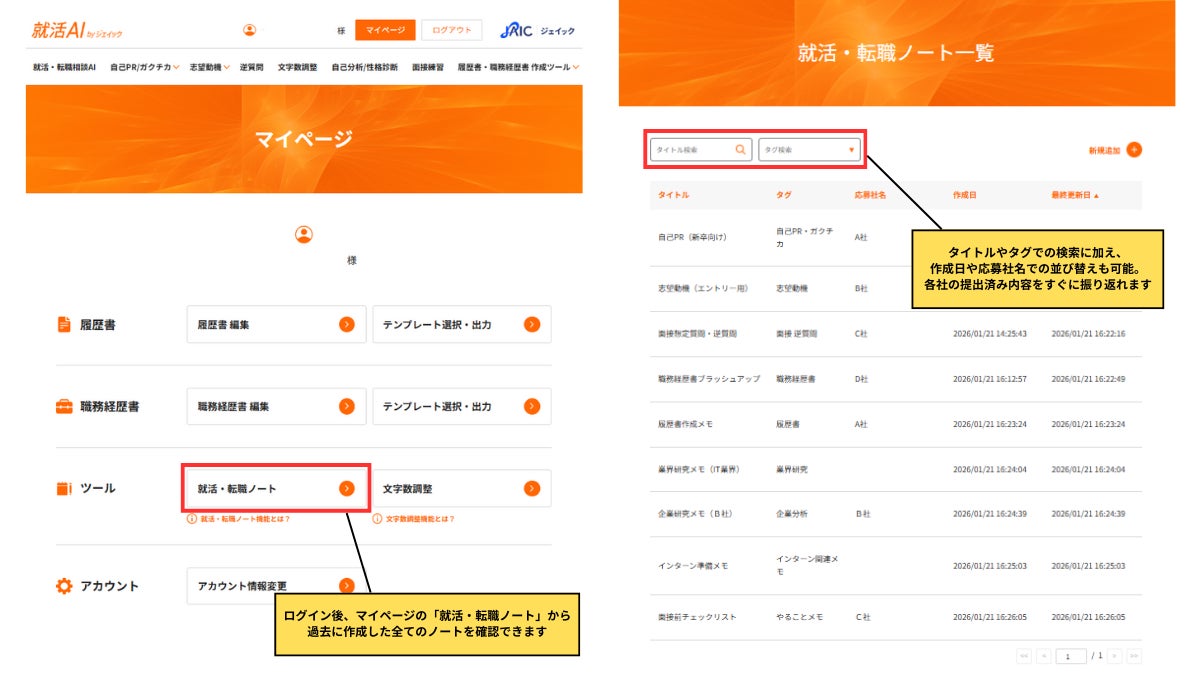 作成したノートは、マイページ内の「就活・転職ノート一覧」から確認でき、タイトル検索やタグ検索にも対応しています。タグは「自己PR/ガクチカ」「志望動機」「面接・逆質問」「自己分析メモ」「業界研究」「インターン関連メモ」「スケジュールメモ」など、全19種類から任意で設定可能です。これにより、企業や業界ごとに提出した自己PRや志望動機を整理・管理しながら、就職・転職活動を効率的に進めることができます。