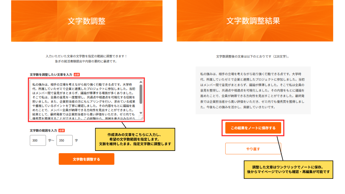 「文字数調整機能」は、作成済みの文章の内容を大きく変えることなく、指定した文字数の範囲内に調整できる機能です。就職・転職活動では、エントリーシートや履歴書など、企業ごとに異なる文字数制限への対応が求められますが、通常の生成AIでは「〇〇文字以上~〇〇文字以下」といった細かな条件への対応を苦手とするケースが少なくありません。本機能では、こうした条件に対応できるため、文章の書き直しにかかる手間を減らし、複数企業への応募準備を効率的に進めることができます。