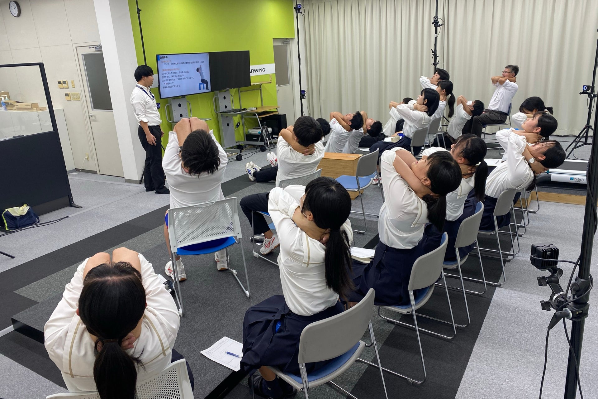 岡山南高校では、岡山県の企業と連携し岡山の魅力を商品化、県内イベントを盛り上げる取り組みを行っています。当社も2020年から一緒に取り組んでおり、今年で5年目になります。2024年は、当社の研究施設に設置している動作解析システム「モーションキャプチャ」を使った胸椎の可動域チェックや、新製品のコンセプトシート作成、アシストスーツミュージアムでの装着体験、運動器年齢を測定できるシステムを使用した身体テストなどを実施しました。