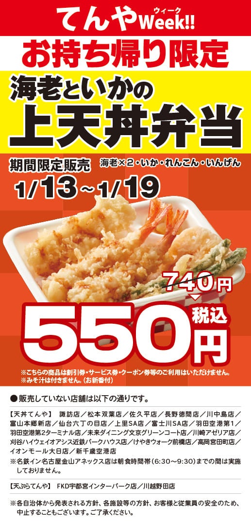 お持ち帰り限定「海老といかの上天丼弁当」 740円(税込)→550円(税込)に
