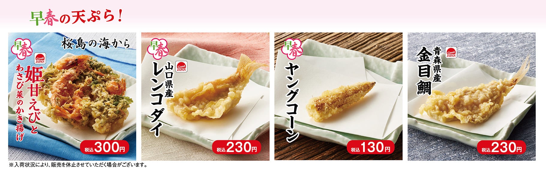 香り高い「姫甘えび」とてんや初登場の「わさび菜」を合わせたサクサクな「かき揚げ」、プリプリな身が特徴の「海老」、柔らかな身が魅力の山口県産「レンコダイ」、シャキっとした食感の「ヤングコーン」、定番の「いか」を合わせ、様々な食感のコントラストを楽しんでいただける一杯に仕上げました。明るい年明けを迎えられるような華やかな彩りの天丼です。