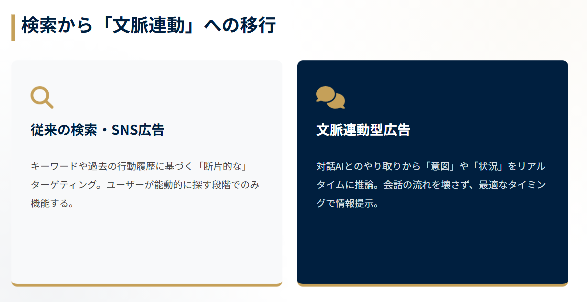 次世代「文脈連動型広告」のプロトタイプ検証: ユーザーの対話文脈を読み取り、違和感なく商品を提案する新たな広告クリエイティブや情報設計のあり方を検証し、コンバージョン(成約)に直結するフォーマットを開発します。