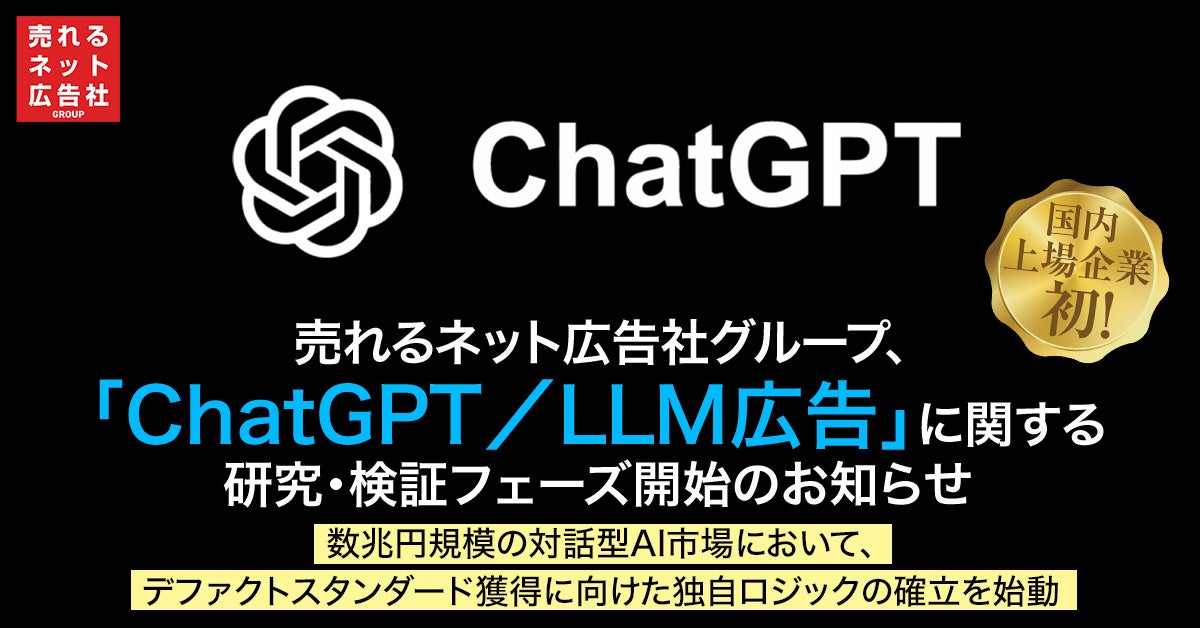 売れるネット広告社グループ株式会社(本社:福岡県福岡市、代表取締役社長 CEO:植木原宗平、東証グロース市場:証券コード9235、以下「当社」)は、2026年1月22日に新設いたしました「ChatGPT/LLM広告事業化部門」における具体的活動の第一弾として、世界的に急拡大する対話型AI市場における先行者利益を独占すべく、当社調べによると国内上場企業としては初めて、「ChatGPT/LLM広告」の勝ちパターンを確立するための「戦略的研究・検証フェーズ」を開始いたしましたので、お知らせいたします。