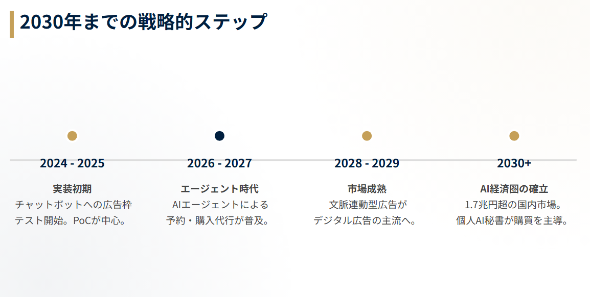 そのため、当社は目先の小規模な収益化にとらわれることなく、将来的に数兆円規模となる本市場において、業界標準(デファクトスタンダード)となる広告モデルを自ら構築・独占するための「戦略的先行投資」として、本フェーズを開始いたしました。 本フェーズでは、対話型AIにおける「勝てる広告表現」および「最強の推奨ロジック」を他社に先駆けて確立し、市場爆発時に圧倒的なシェアを独占するための準備を完了させます。