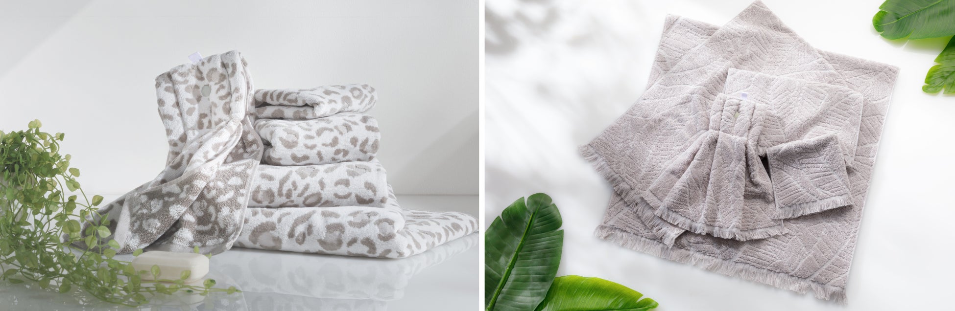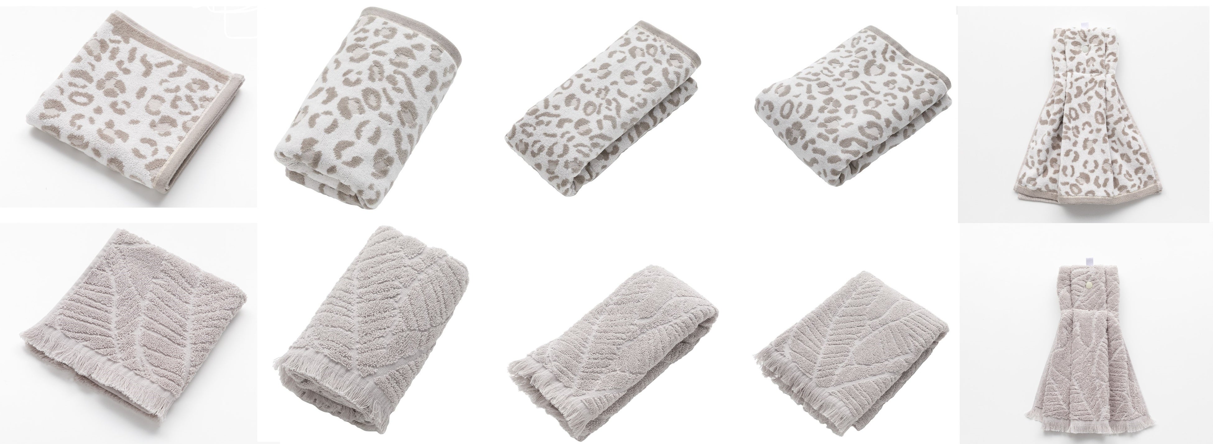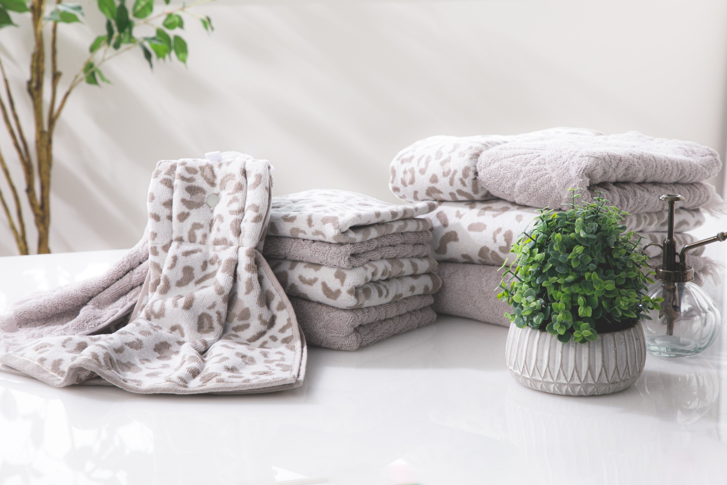 ファッションで人気のレオパード柄には、ふちに一部ラメの装飾が施されており、バスシーンを一層華やかに彩ります。バナナリーフ柄は、上品なライトグレーカラーで、立体的な柄織とフリンジが特徴です。