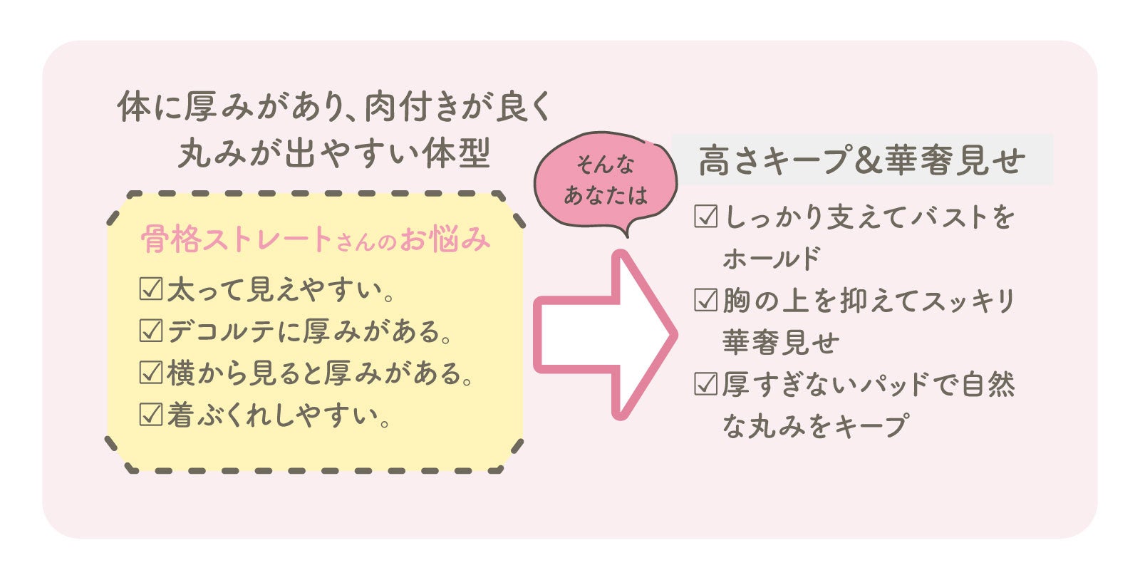 今回開発したブラは、骨格タイプに合わせた設計で、それぞれの特徴を活かしつつ、スタイルアップを叶える工夫を取り入れています。骨格に合ったアイテムを選ぶことで、自然で美しいシルエットにサポートしてくれます。ぜひ試してみてください!
