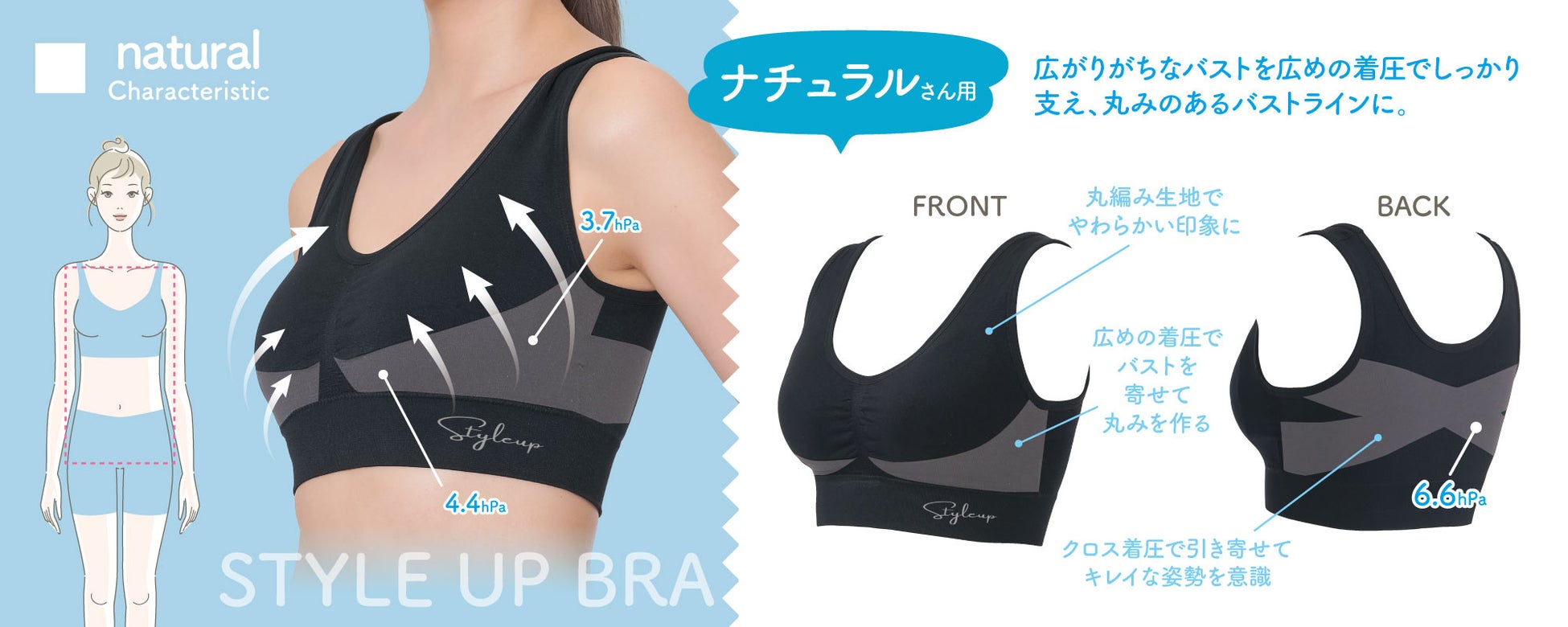 バストは広がりがちでフラットに見やすくハリや丸みが出にくいナチュラルさんは幅広の着圧が下から全体を持ち上げて立体感をアップ。背中からサイドにかけて引き締めることで、自然なボリュームとやわらかい丸みのある立体バストに♪