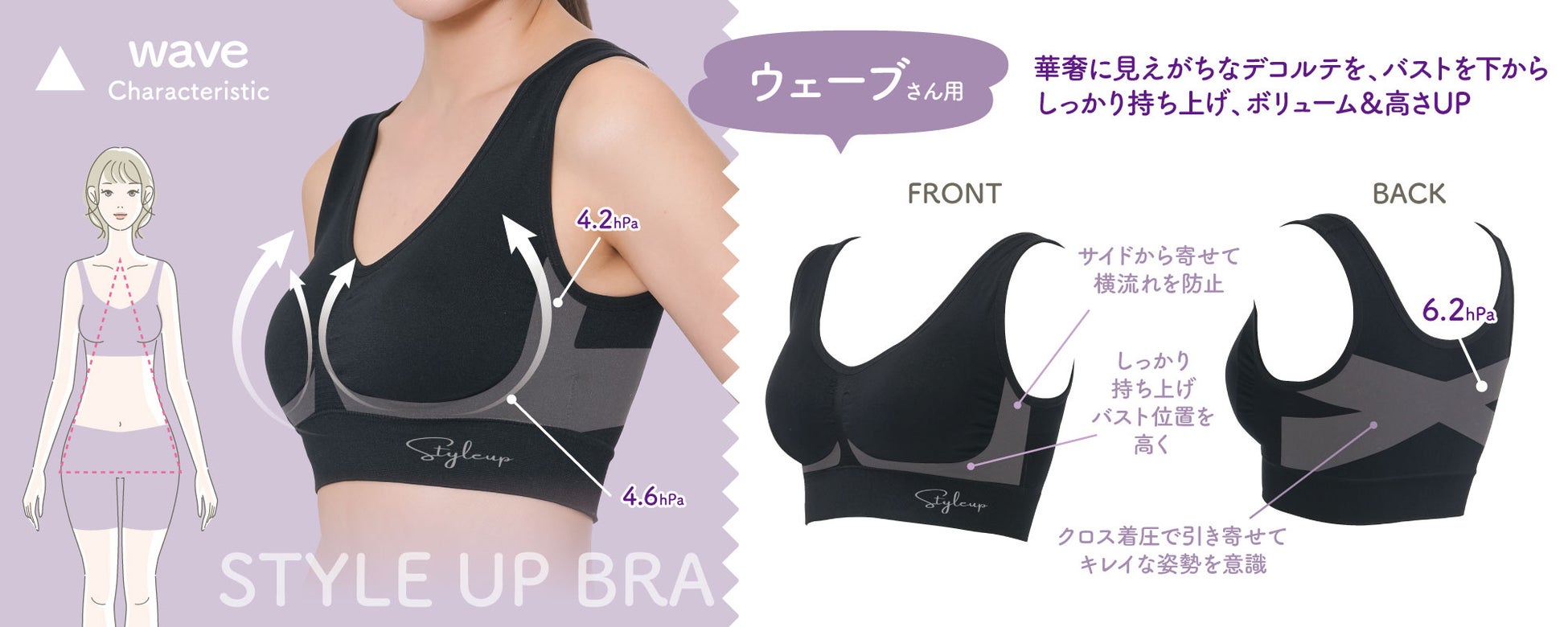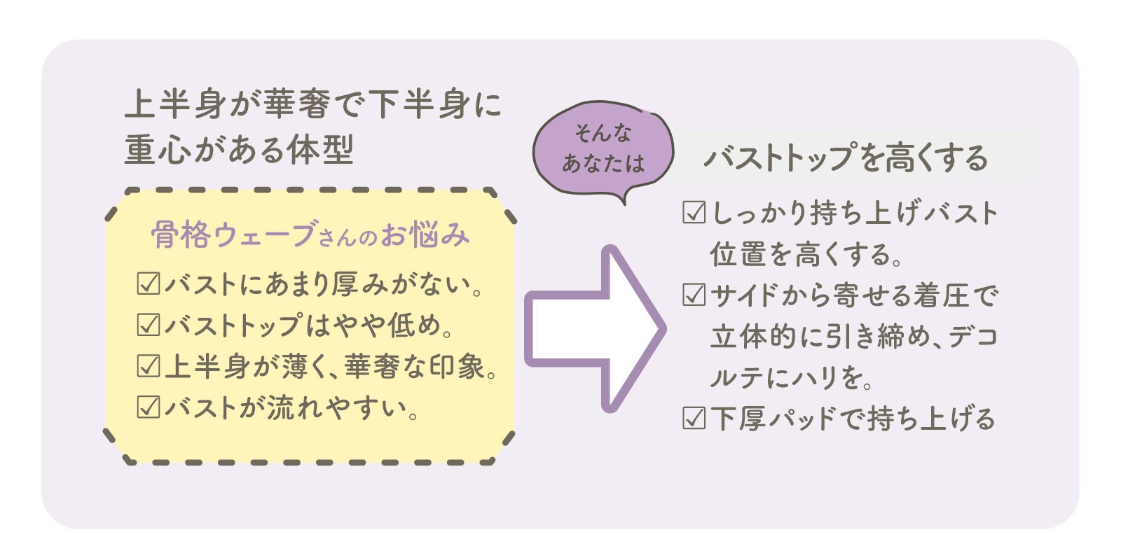 バストにあまり厚みがなくバストトップはやや低めで華奢なウェーブさんは中心から脇にかけての着圧がバストを包み込むように持ち上げ、位置を高くキープ。サイドから寄せる着圧と下厚パッドで、ふんわり丸みのあるボリュームバストに♪