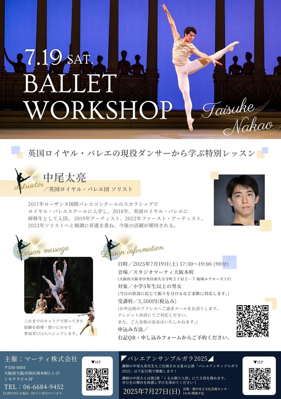 なお講師の中尾太亮さんは「バレエアンサンブルガラ2025・大阪公演」へも出演が決定しているダンサーです。