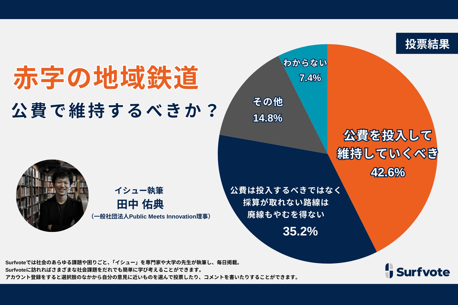 ミレニアル世代のシンクタンク一般社団法人Public Meets Innovation理事の田中佑典氏がSurfvoteで課題提起。公費で赤字鉄道を維持すべきかどうか、さまざまな意見が寄せられました。