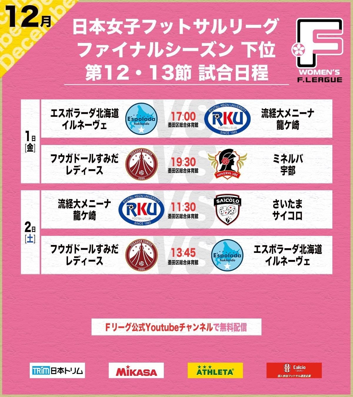 今週末は、ファイナルシーズン上位リーグを福井県営体育館で、ファイナルシーズン下位リーグを墨田区総合体育館でそれぞれ開催いたします。福井会場では、西宮・浦安の両試合結果によって、浦安のリーグ優勝が決定する可能性があります。熾烈な優勝争いの行方は目が離せません。また、ホームゲームとなる福井丸岡は、4試合ぶりの勝利をあげることができるか注目です。一方、ファイナルシーズン下位リーグは、今週末の墨田会場で、ファイナルシーズン 下位リーグ 第12節・第13節を迎えます。ホームゲームとなるすみだが2試合ぶりの勝利をあげることができるか注目です。今週末の試合より、Fリーグ公式Youtubeチャンネルで全試合をライブ配信いたします。ぜひご視聴ください!