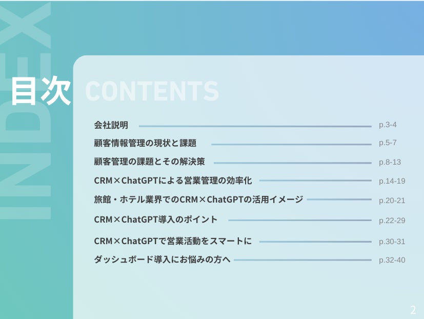 株式会社ベクトル(本社:東京都港区、代表取締役会長兼社長:西江 肇司、東証プライム:6058)の子会社であるOwned株式会社(東京都品川区、代表取締役社長、石井翔、以下「当社」)は、旅館・ホテル業界向けに「CRM×ChatGPTで営業管理をする方法をまとめたレポート」2025年3月版(全40ページ)を無料公開いたしました。