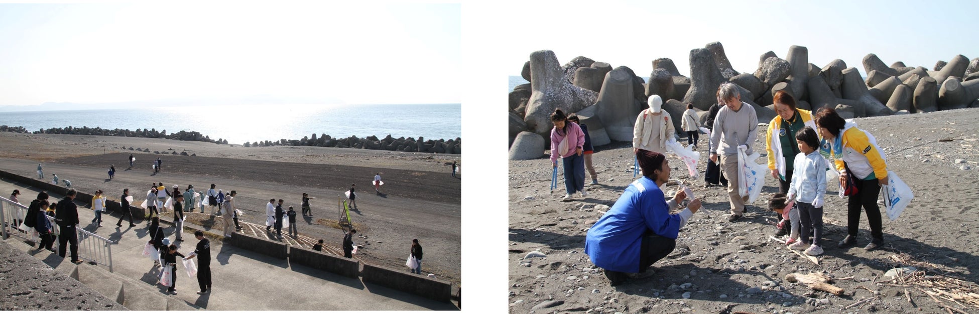 本イベントには180名が事前に参加エントリーし、当日は158名で富士市富士マリンプールの周辺海岸を中心に清掃活動に取り組みました。静岡県内東部地区を中心に集まった参加者は、海岸でごみ拾いをするだけではなく、清掃範囲内に設置された海洋ごみに関するクイズを解きながら海岸の清掃活動を実施しました。実際にごみを拾いながら現状を意識してもらうために富士市の「ごみ処理状況」や「ごみの種類の割合」、「ごみ処理総量は、どのくらい減っているか」などを問題に出題しました。なかなか知ることのない現状をごみを拾いながら感じ、改めて自分達の日々の生活について考えるきっかけになりました。