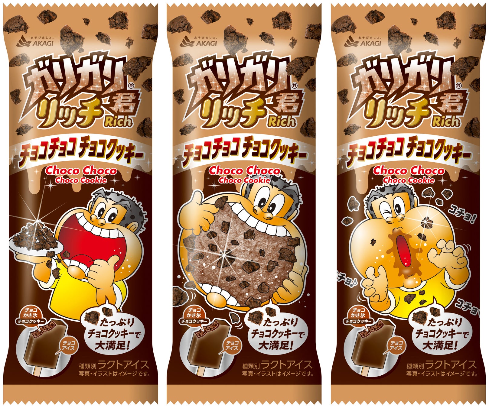 「ガリガリ君リッチチョコチョコチョコクッキー」は、チョコアイスの中に、たっぷりのチョコクッキーを混ぜ込んだチョコかき氷を入れたアイスキャンディーです。通常のガリガリ君よりも氷のサイズを細かく、少なくすることで、秋冬向けに冷たすぎず、濃い味わいに仕上げました。