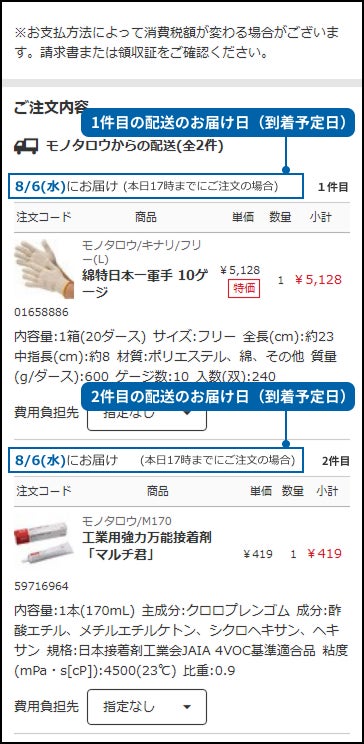 - ご注文内容確認画面にて、お届け単位ごとに表示されます。