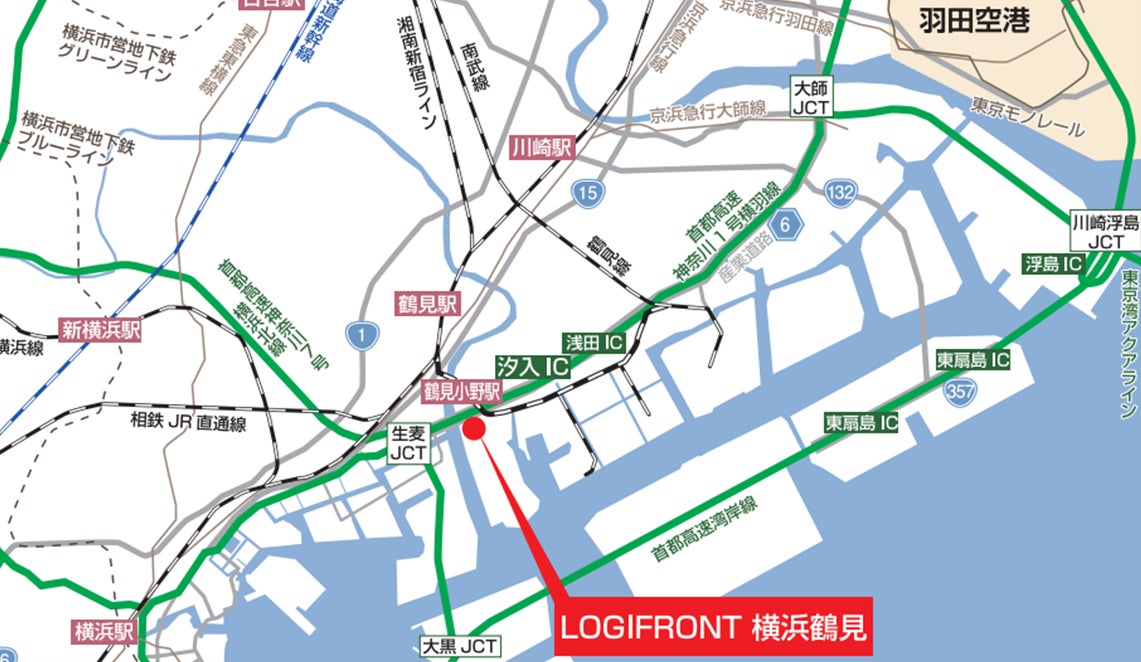 本物件は、神奈川県道6号東京大師横浜線(通称:産業道路)沿いに面し、首都高速道路「生麦」ICから約900m、首都高速道路「汐入」ICから約1.2㎞にあり、さらに、工業専用地域で物流倉庫として優れた操業環境であることなどに着目し、首都圏全体を網羅する利便性に富む物流拠点として計画されています。また、JR鶴見線「鶴見小野」駅から徒歩6分圏内にあり、隣接住宅エリアからの雇用者確保にも期待できる環境です。