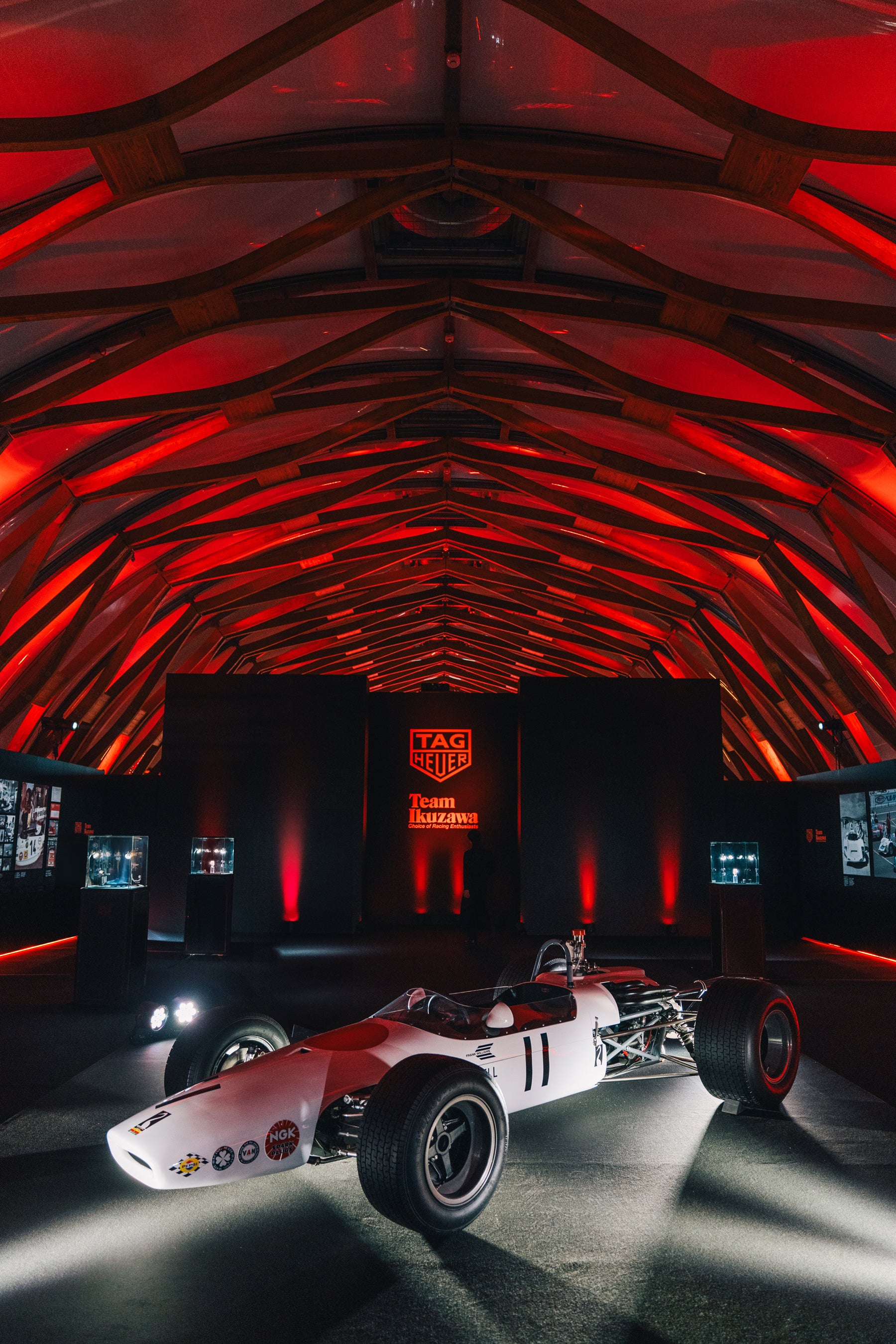 会場は二つのエリアで構成され、一つではタグ・ホイヤーとチーム イクザワ のこれまでと現在の活動を紹介し、もう一つではスイスにあるタグ・ホイヤーの本社から取り寄せたアーカイブスとチーム イクザワ のガレージが保有するレーシングカーのコレクションを展示しました。