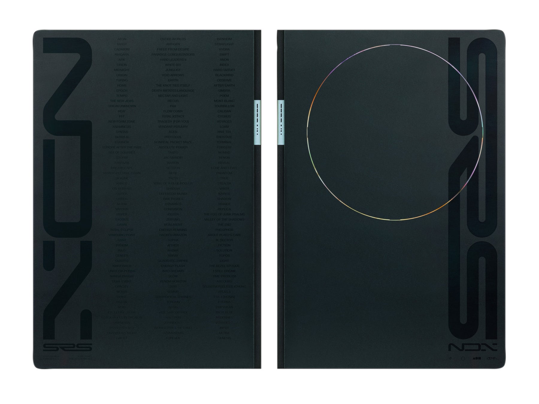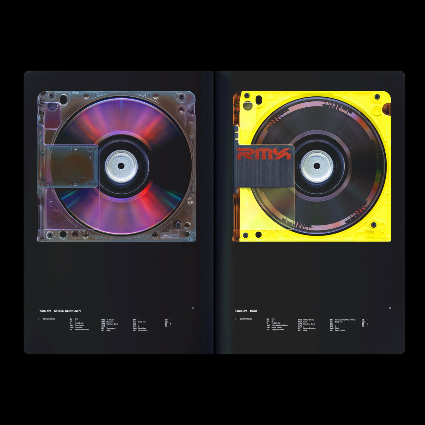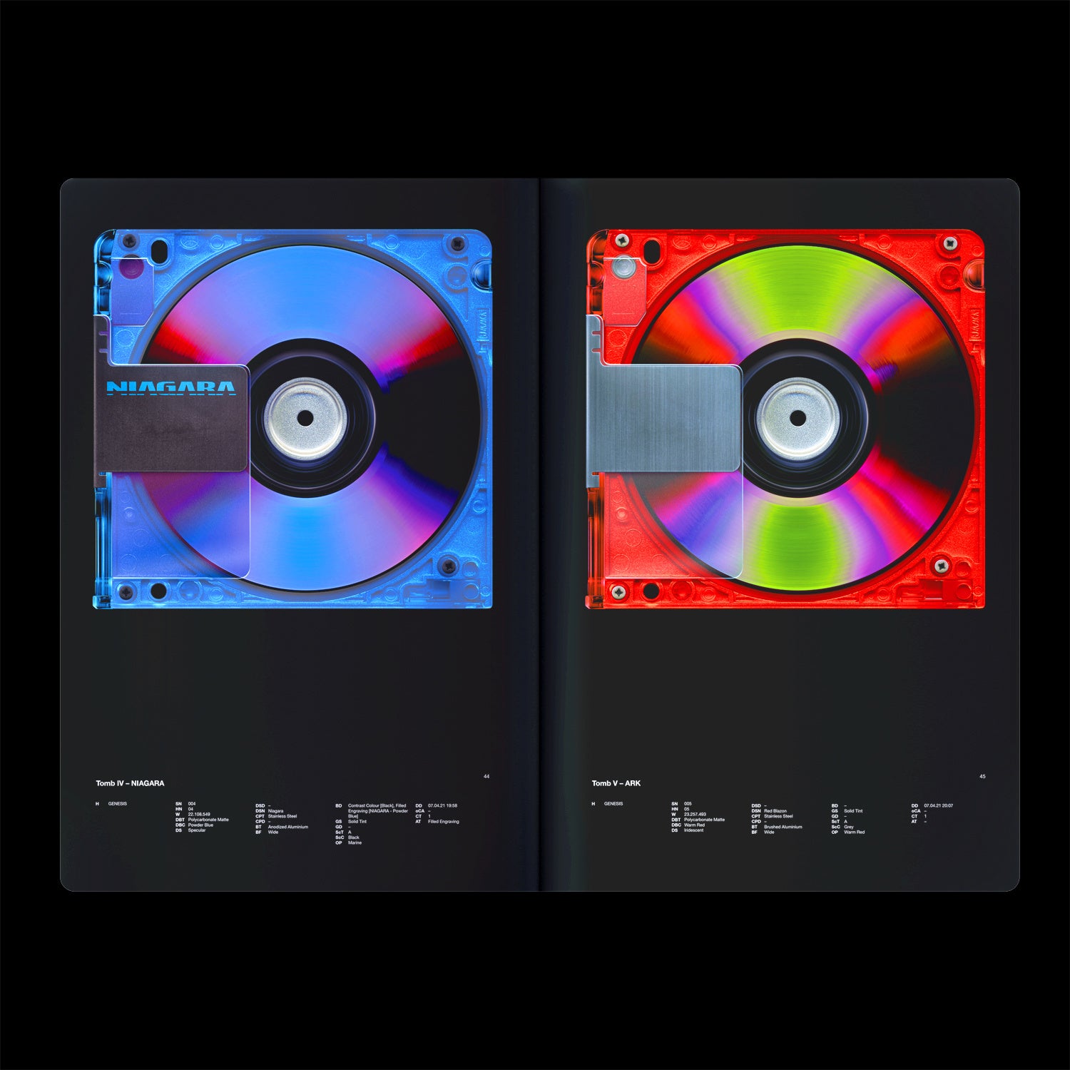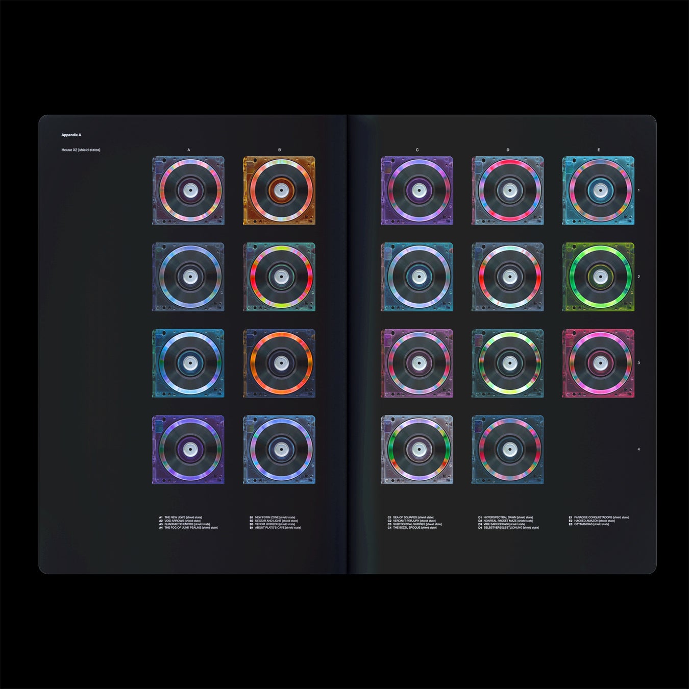 ・Hardcover w/ cover + backcover screenprints [Gloss Black], die-cut iridescent foil emboss 746 illustrations, printed in Terrain6, custom colourspace developed by terrain, unique to the Tomb Index