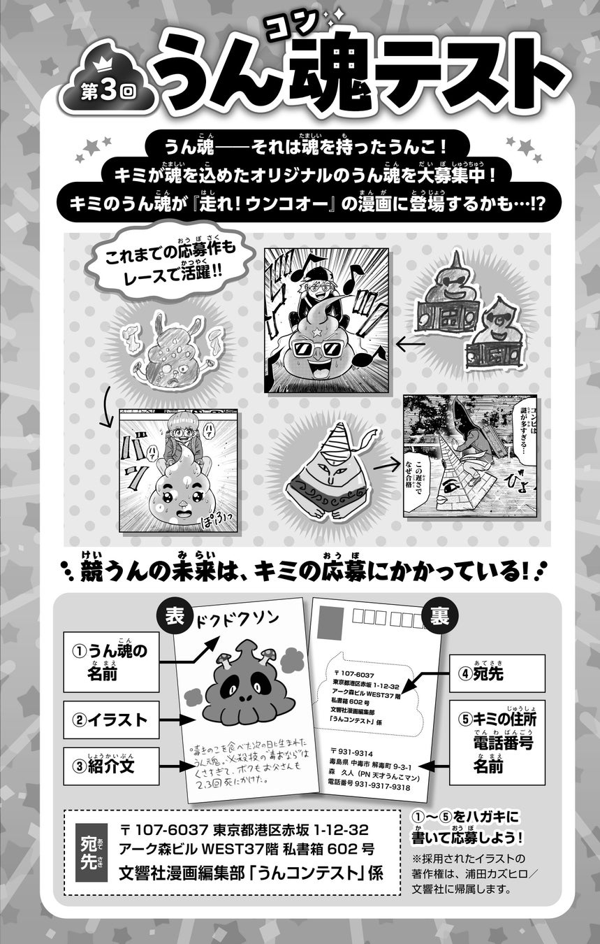 主人公・光太と、そのうん魂・ウンコオーは、プロへの夢をかけ、競うん学校卒業レースに挑む!