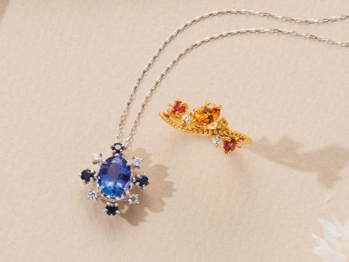 自分を満たすジュエリーを紹介するN essenceからは、夕焼けをイメージしたジェムコレクションを紹介。タンザナイトのペンダントなど、繊細なディテールや色使いのジュエリーに注目です。