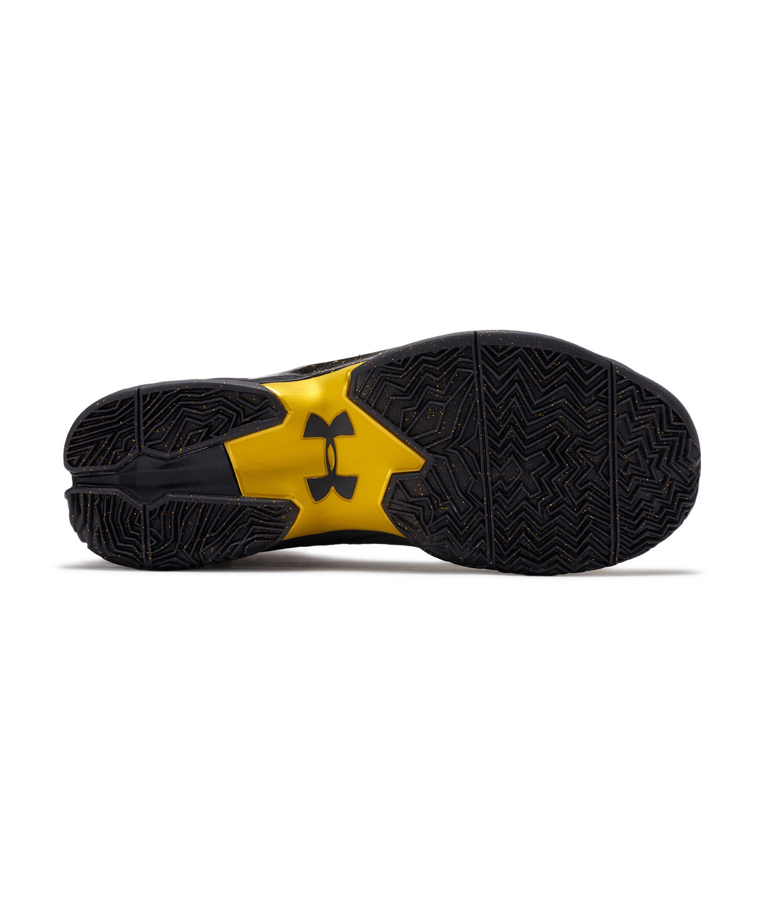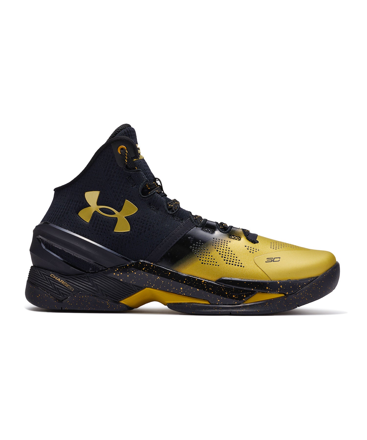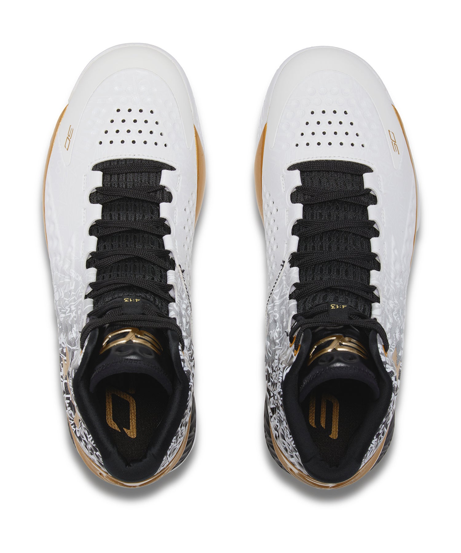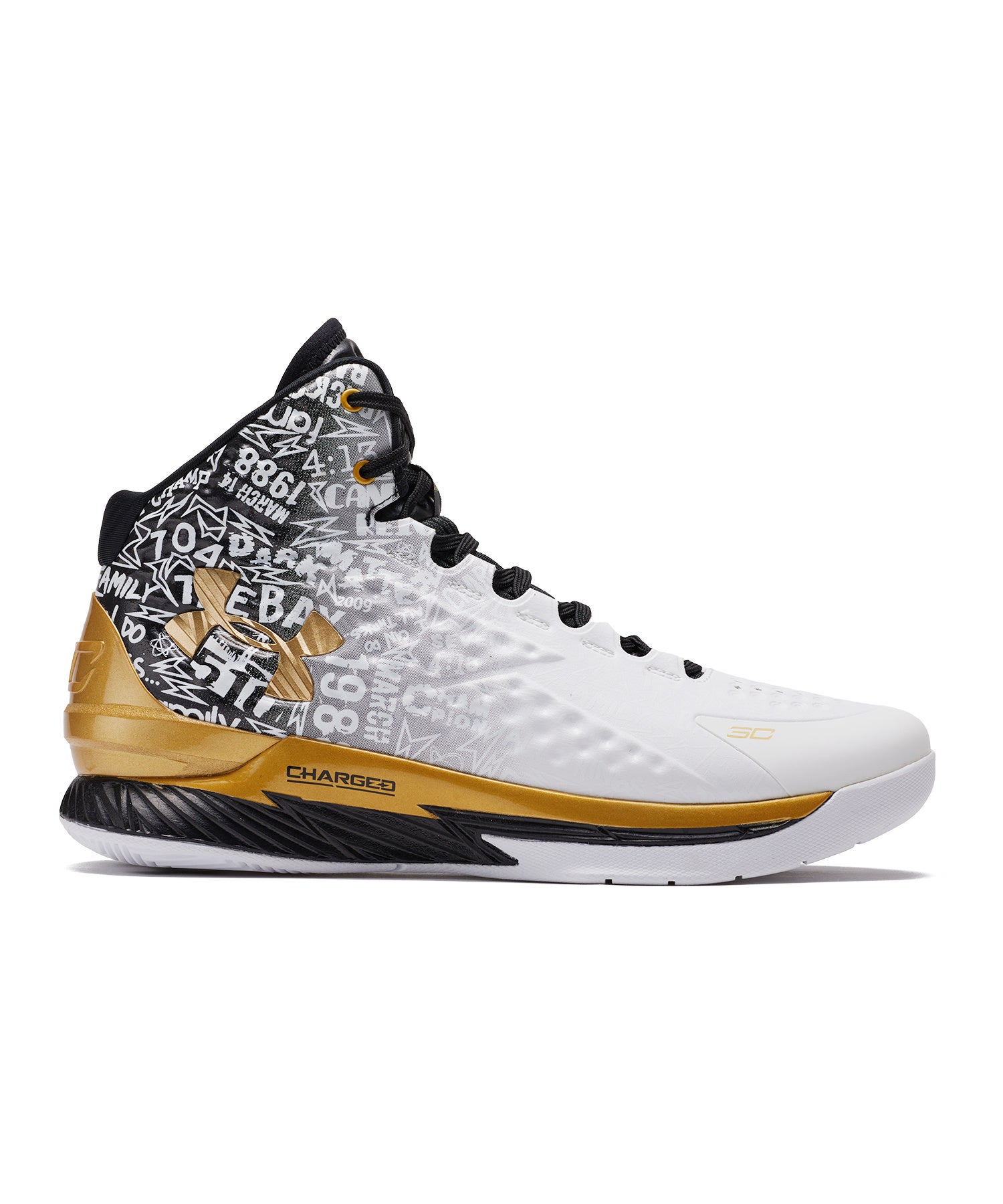 ブラック&ホワイトのグラデーションが目を惹くアッパーには、カリーの誕生日「1988.MARCH14」、彼が最も大切にしている「FAMILY」や、好きな言葉である「UNDERDOG」などの文字が刻まれている。また、ゴールドのヒールカウンターは、黄金に輝くトロフィーをモチーフにしている。