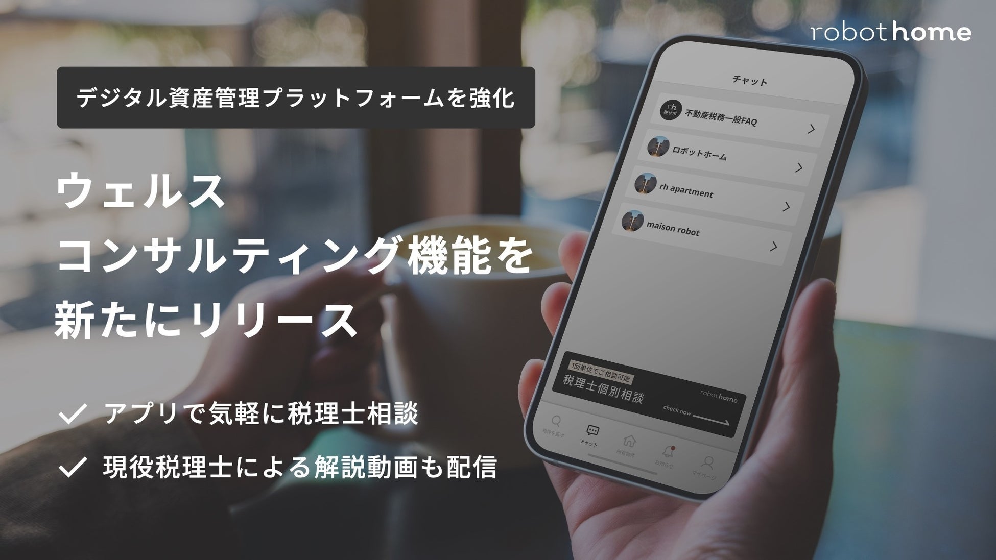 株式会社robot home(本社:東京都中央区/代表取締役CEO:古木大咲/証券コード:1435、以下当社)は、ウェルステック領域の強化を目的として、当社が提供するデジタル資産管理プラットフォームにおいてウェルスコンサルティング機能をリリースしましたので、お知らせいたします。