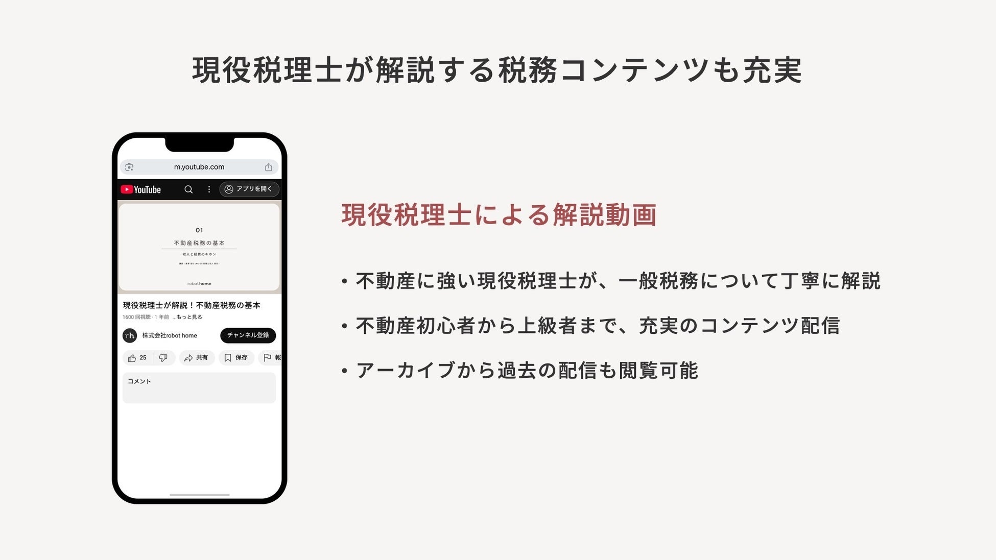 従来、税務に関する相談は自身でwebや書籍で調べるか、顧問契約を締結している税理士へ依頼することが主流でした。この度のサービス開始に伴い、当社がご紹介する税理士への個別相談をアプリから問い合わせることが可能になりました。その結果、不動産の購入・保有に関する税務相談はもちろん、相続税対策など長期的な資産戦略をお考えの方のニーズにも沿ったソリューションの提供が可能になります。さらに、税理士監修の税務学習動画コンテンツを定期配信することで、不動産投資に関連した周辺領域の付加価値提供を強化いたします。