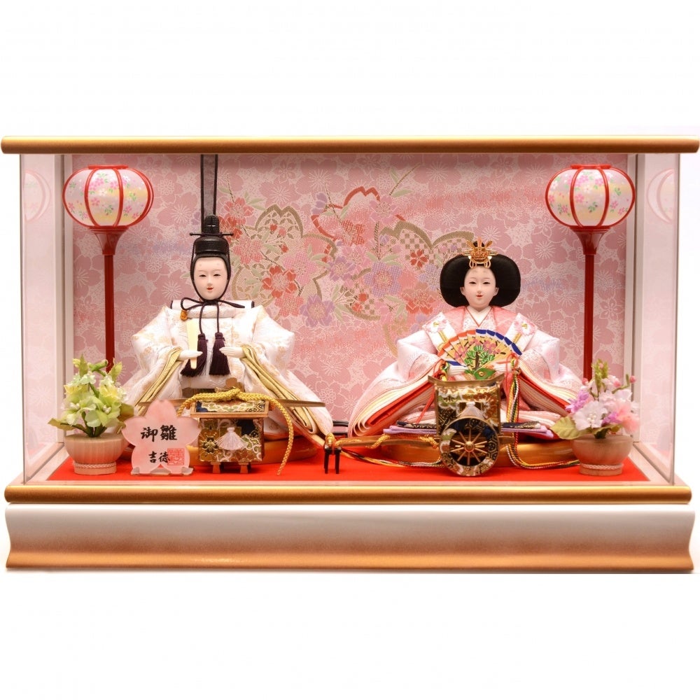 白色と金色を基調とした優しい色合いで、和室にも洋室にも合います。軽くて丈夫なアクリルケースを使用しており、正面に柱のないパノラマタイプです。 背景には満開の桜を施しました。人形等がケースに固定され、梱包されていますので、梱包箱から出すだけでお飾りいただけます。