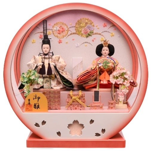 丸形のケースにお人形を入れた、可愛らしく個性溢れるデザインです。ほんのりピンクをぼかしたケースの正面には桜の模様を施し、お道具もピンク色で統一しました。ケースは軽くて丈夫なアクリルケースです。コンパクトサイズで飾る場所を選びません。ケースの前面はマグネットで取り外し可能です。人形等がケースに固定され、梱包されていますので、梱包箱から出すだけでお飾りいただけます。