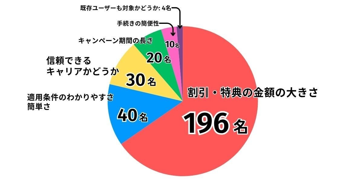 キャンペーンを選ぶ際に最も重視するポイントについては、「割引・特典の金額の大きさ」が196名(65.3%)で圧倒的多数を占めました。次いで「適用条件のわかりやすさ・簡単さ」40名(13.3%)、「信頼できるキャリアかどうか」30名(10%)となっています。