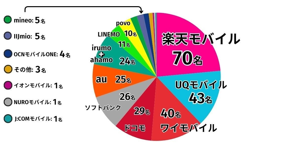 大手3キャリア(ドコモ、au、ソフトバンク)は合計80名(26.7%)で、楽天モバイルを含むMVNOや格安SIMが73%を占める結果となりました。